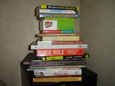 As well as the Pick Up Sticks sushi wallet kit in red and the felted snug boots kit in Sand and Seafoam. He did a wonderful job picking out beautiful clothing (which included awesome t-shirts and cashmere sweater). He also got me dvds, Rock Band 2, Guitar Hero: World Tour, amazing diamond earrings, necklace and a watch. He also got me a bunch of books. Here's a picture of the stack (the top three are the ones I got my boyfriend who is a huge Mystery Science Theatre 3000 fan):