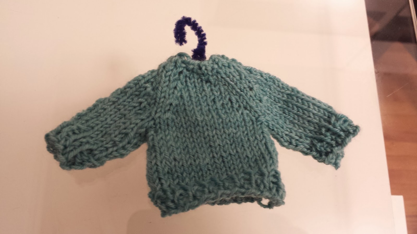 Christmas Sweater Ornament for Jim's mother. I used some Lorna's Laces Shepard Sock weight yarn in turquoise and if I remember correctly, size 1 needles. It took about four to five hours but turned out great. My only regret is not embroidering the year on it.